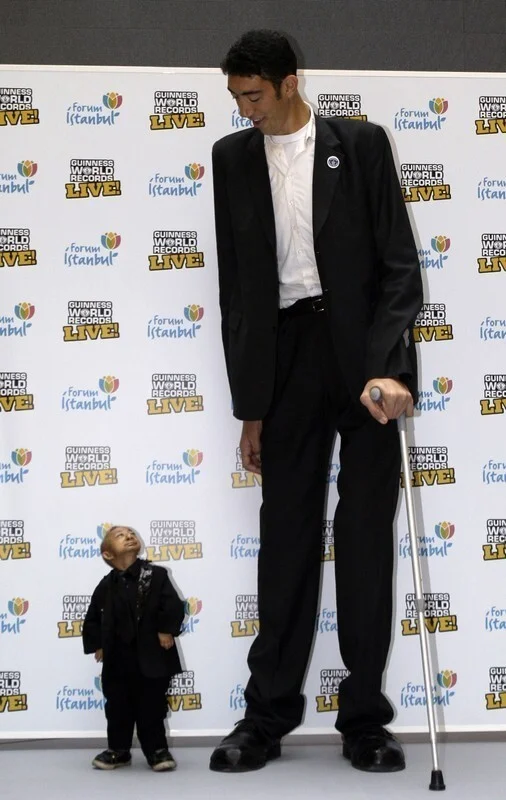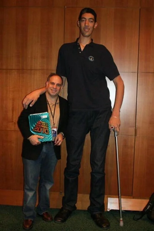На фото Султан позирует с бывшим самым маленьким человеком в мире, Хэ Пинпином. Рост Пинпина составлял чуть более 74 см