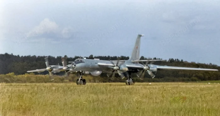 Дальний противолодочный самолёт Ту-142М 35-й противолодочной авиационной дивизии дальнего действия Северного флота в полёте. Аэродром Кипелово, Вологодская область, 1988 год.
