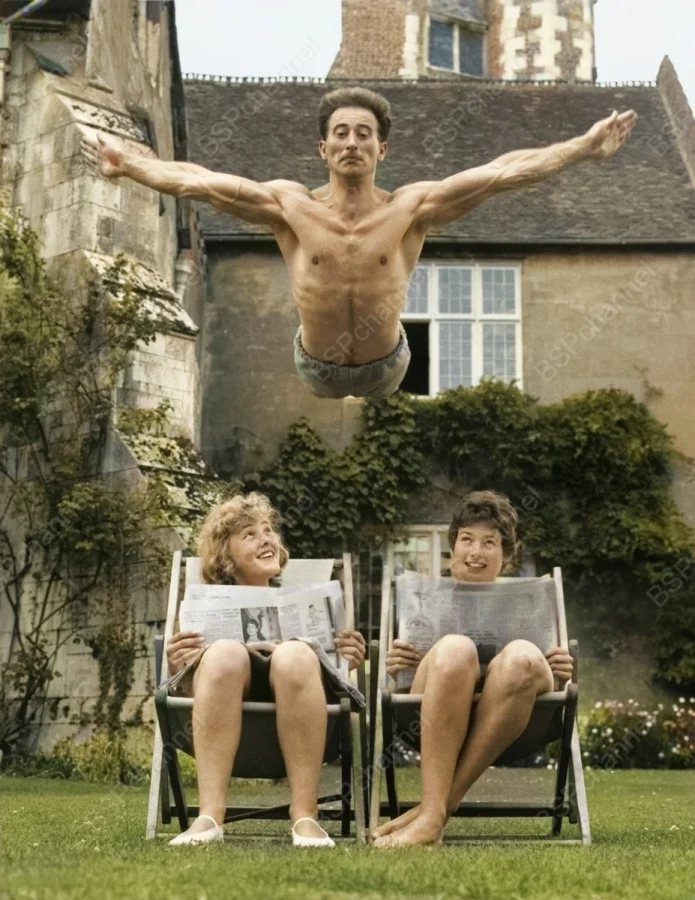 Бернард Которн, корабельный инспектор из Халла, выполняет "кувырок вперед" через головы двух девушек, которые также посещают курсы гимнастики в Бишем-Эбби в Беркшире. Великобритания, 1959 год.