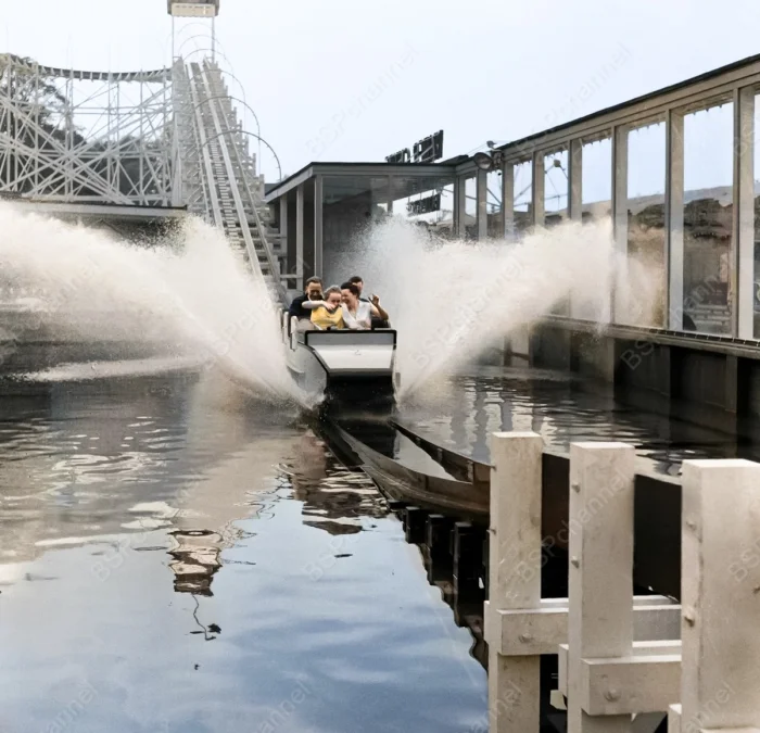 Британская актриса Барбара Виндзор и ученица британской театральной школы Патрисия Старк катаются на водном аттракционе «Водяной желоб» на ярмарке в парке развлечений Battersea Festival Gardens. Лондон, Англия, 1955 год.