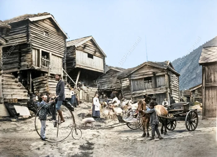 Мужчина на велосипеде пенни-фартинг в норвежской деревушке. Королевство Норвегия, 1885 год.