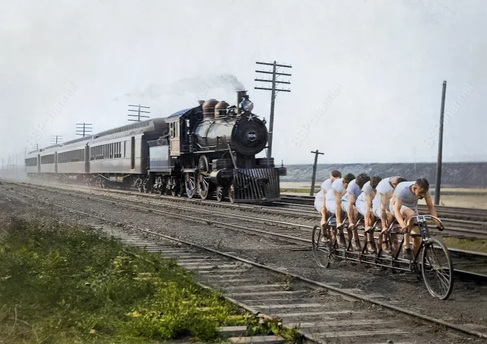 Велосипедисты на шестиместном байке пытаются обогнать поезд, 1896 год.