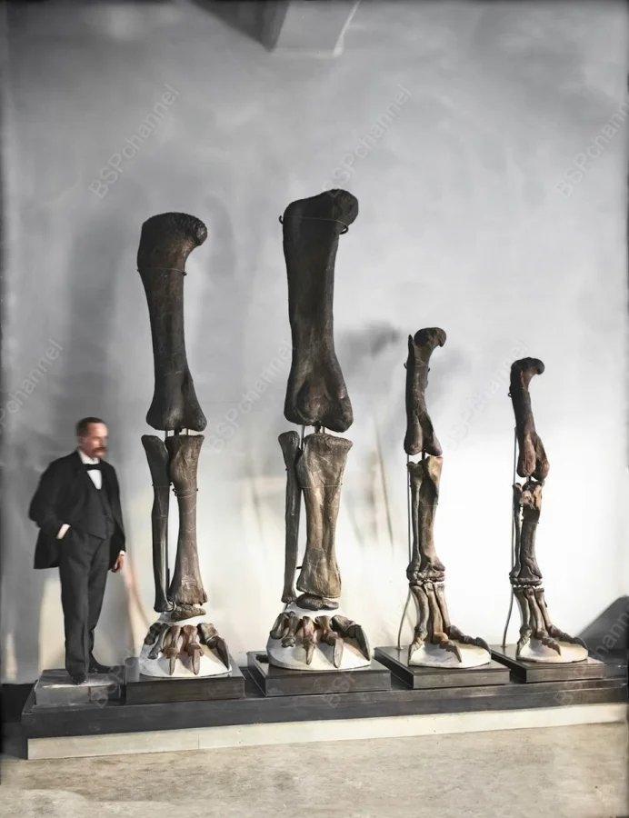 Палеонтолог Генри Осборн с конечностями динозавров, 1899 год.