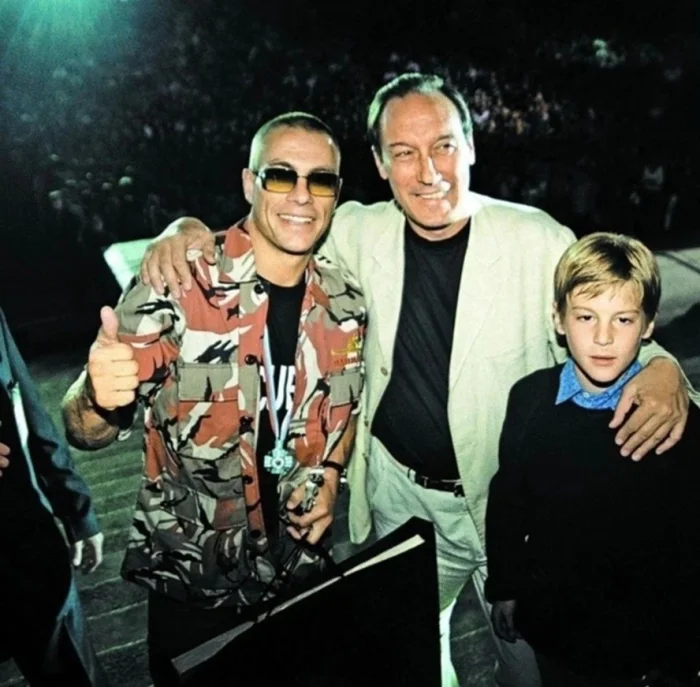 19. Жан Клод Ван Дамм, Олег Янковский и его внук Иван на фестивале "Кинотавр", Сочи, 2001 год