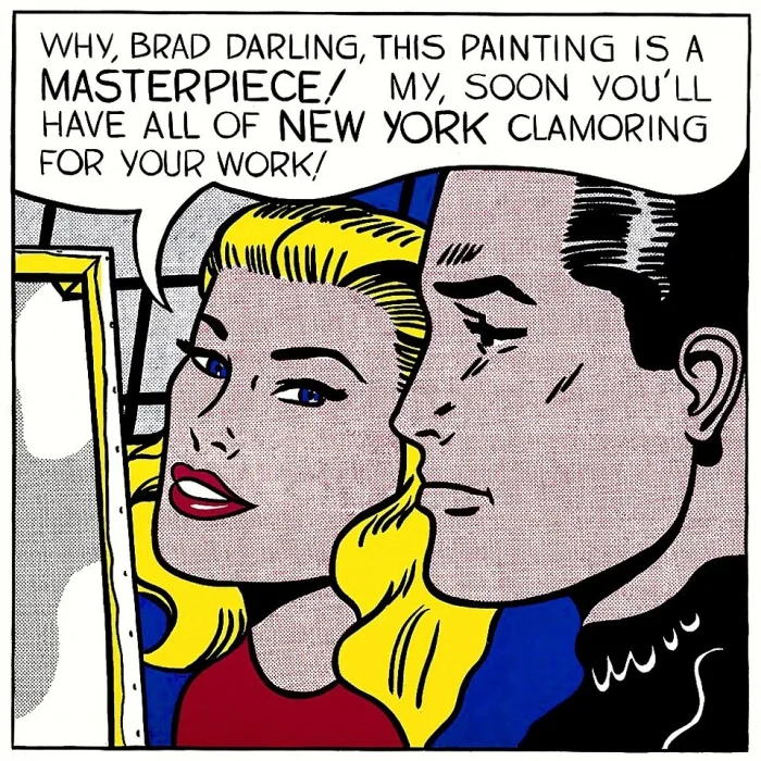 «Шедевр» Лихтенштейна — да, за это заплатили 165 миллионов долларов! За постер! А ведь художник, скорее всего, хотел посмеяться над идиотами, которые принимают поп-арт за высокое искусство. Надпись на картине: "Милый Брэд, эта картина — шедевр! Скоро весь Нью-Йорк будет сходить с ума по твоим работам!" Ирония, которую рынок проглотил вместе с рамой.