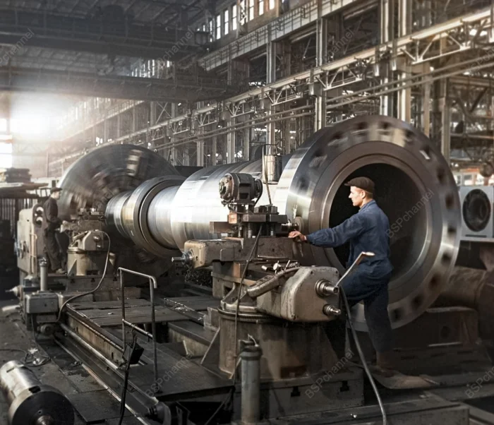 Обработка вала ротора генератора. Новосибирский турбогенераторный завод, 1962 год.