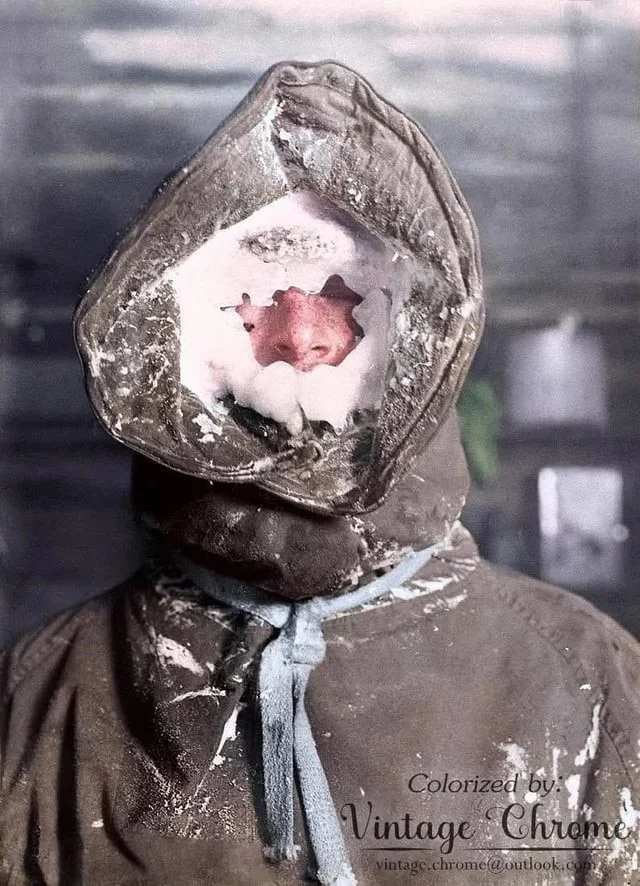 Возвращаясь на базу на мысе Денисон во время метели, его лицо покрылось ледяной коркой, образовавшей своеобразную маску.