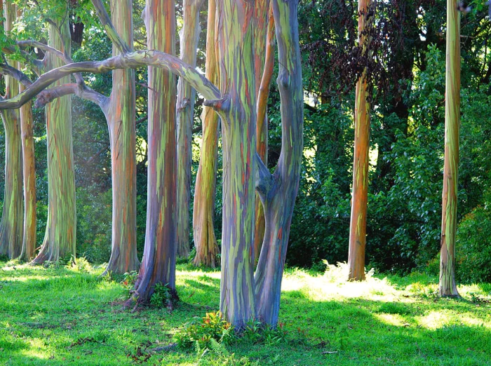 Его ствол естественным образом переливается всеми цветами радуги благодаря постепенному отслоению коры. Это настоящее живое произведение искусства с Гавайев.