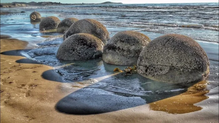 На восточном побережье Новой Зеландии расположены загадочные каменные сферы диаметром до 3 метров. Эти идеально круглые валуны образовались более 50 миллионов лет назад в результате геологических процессов. Тысячелетия эрозии береговой линии постепенно освободили их из песчаного плена, создав это удивительное зрелище.