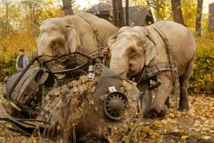 Цирковые слоны Кири и Мэни помогают убирать завалы на улицах разрушенного Гамбурга. Британская оккупационная зона в Германии. Ноябрь 1945 года.