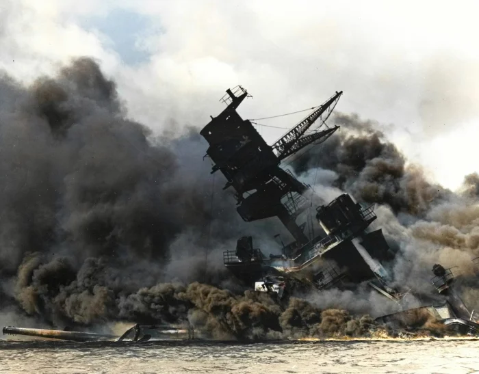 Линейный корабль "Аризона" охвачен пламенем после атаки японской авиации на военно-морскую базу Перл-Харбор 7 декабря 1941 года. Мощный взрыв в носовом артиллерийском погребе привёл к катастрофическим разрушениям судна, в результате чего погибло более 1100 моряков - практически весь экипаж. Останки "Аризоны" остались на дне гавани, превратившись в мемориал погибшим и символ вступления США во Вторую мировую войну.