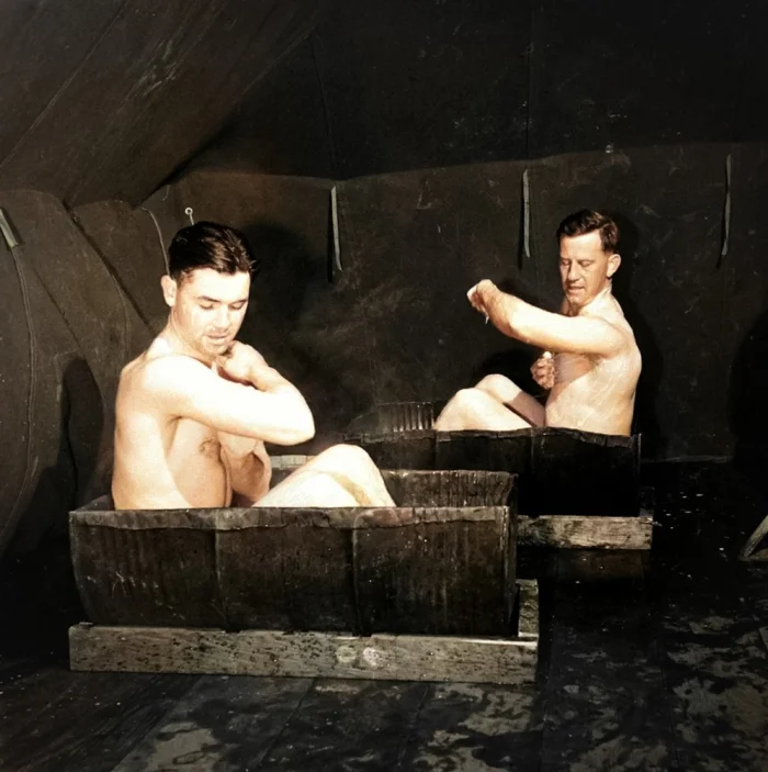 Военнослужащие на отдалённом посту времён Второй мировой войны на острове Амчитка (Аляска) принимают ванну в разрезанных нефтяных бочках, 1943 год.
