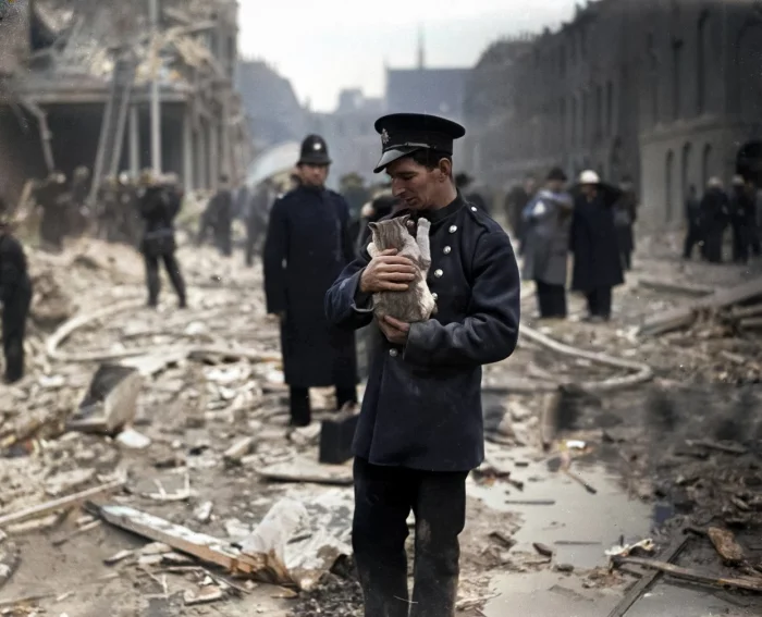Спасатель с кошкой на руках среди руин на Джадд-стрит, разрушенных немецкой бомбой. Лондон, 1945 год.