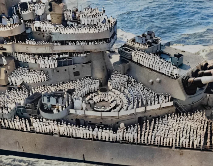 Американский линкор "Миссури" (USS Missouri, BB-63) во время церемонии подписания капитуляции Японии, 1945 год.