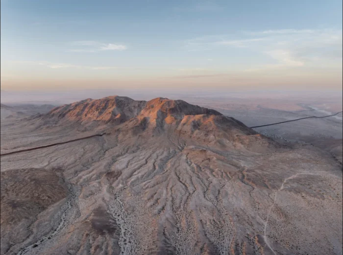 Заходящее солнце освещает гору, которая образует брешь в пограничной стене недалеко от Мехикали, Нижняя Калифорния.