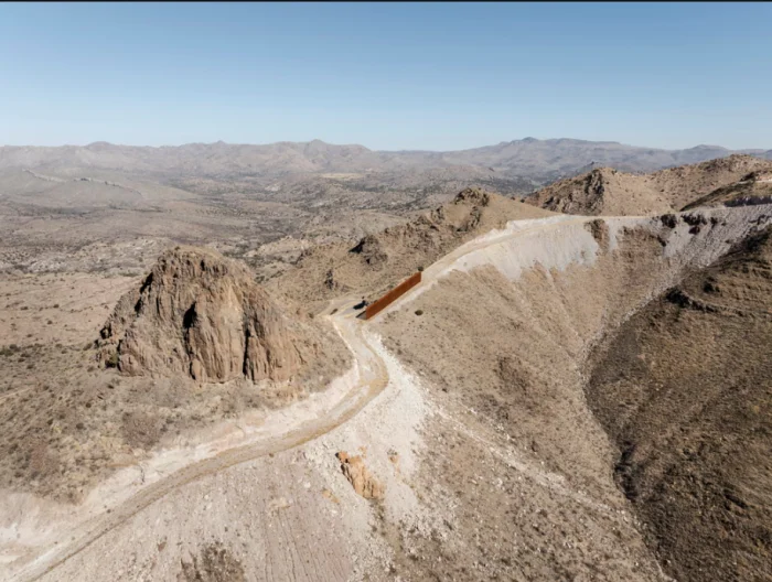 Открытая «дверь» вдоль пограничного забора между штатом Сонора в Мексике и Аризоной в США. Забор сделан из соединённых между собой стальных планок.