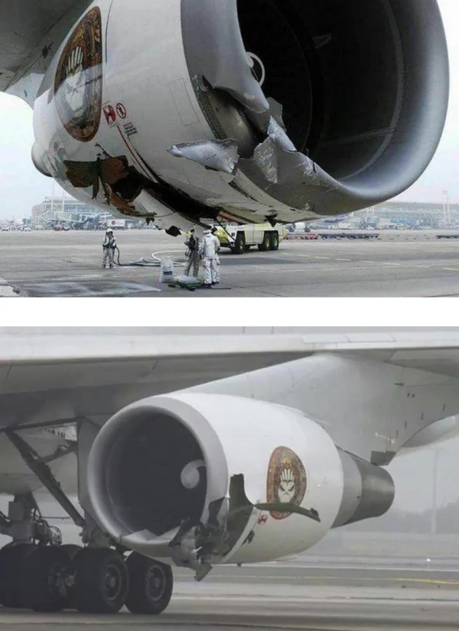 Это последствия взрыва одного из двигателей. Мастерству пилотов можно посвящать целые поэмы! Ведь не каждый способен сохранять хладнокровие в таких условиях. Для пассажиров этот полет стал настоящим испытанием.