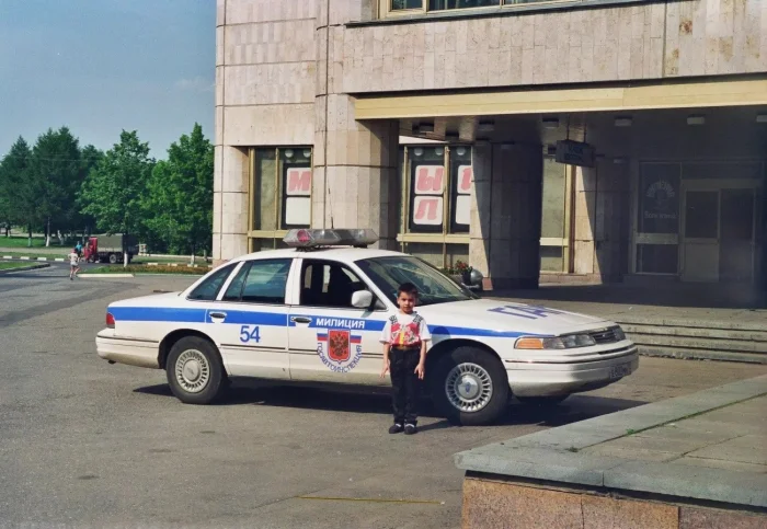 11. Молодой человек фотографируется у служебного Ford Crown Victoria московского ГАИ возле кинотеатра «Волгоград», 1993 год.