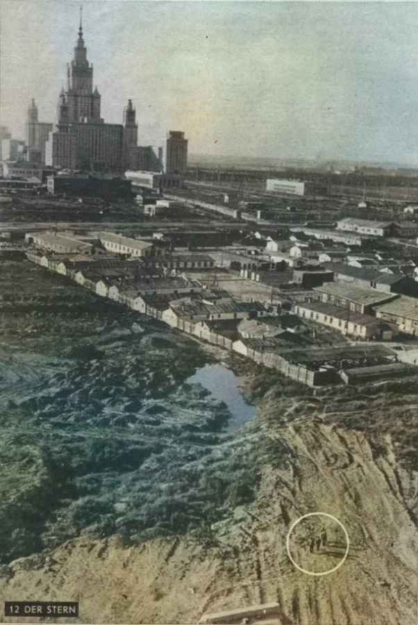 Фотография сделана с высоты 17-го этажа строящегося здания на Ленинских горах. Московские высотки возводятся ударными темпами, хотя в нескольких сотнях метров сохраняется беспорядок. Москва начала превращаться из деревянного города в каменный только к 1930 году.
