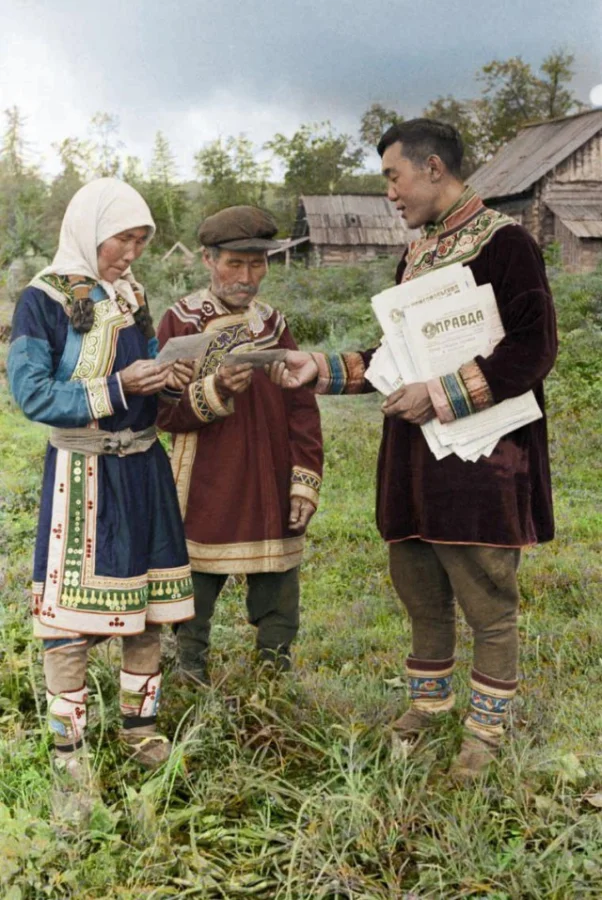Почтальон доставляет письма и газету "Правда" в деревню Гвасюги, Хабаровский край, 1947 год