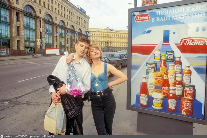 Молодая пара у рекламного стенда продукции «Heinz» около «Детского Мира» на Лубянке.