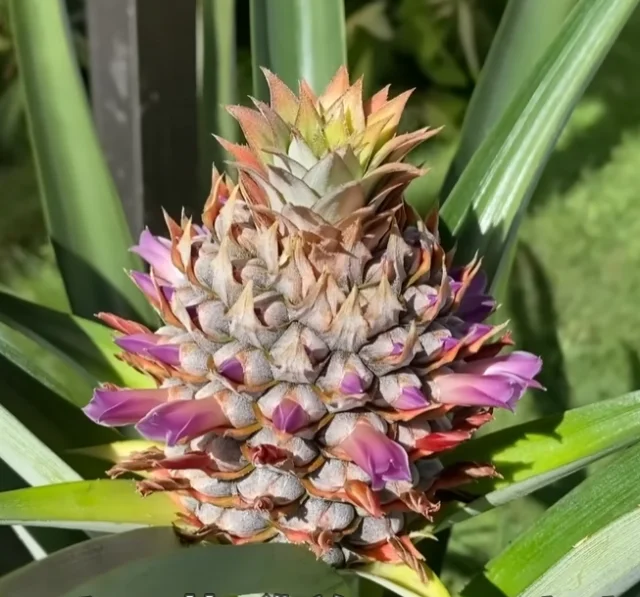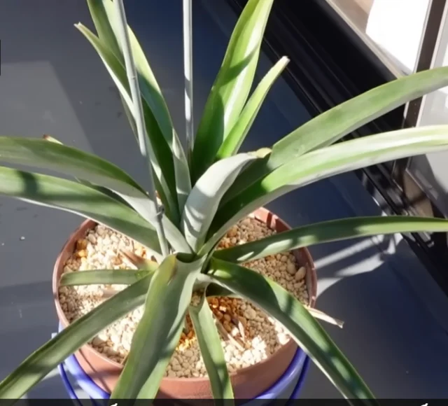 В течение года он ухаживал за растением, менял почву и оно стало высотой в 40 сантиметров. Вторая зима не прошла без проблем - растение начало шататься, но опора спасла ситуацию. На третий год жизни ананас начал цвести.