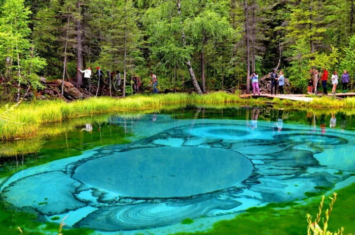 18. Алтайское Гейзерное озеро (также известное как Голубое или Серебряное) знаменито своими причудливыми узорами из голубой глины и мелкого песка на поверхности воды