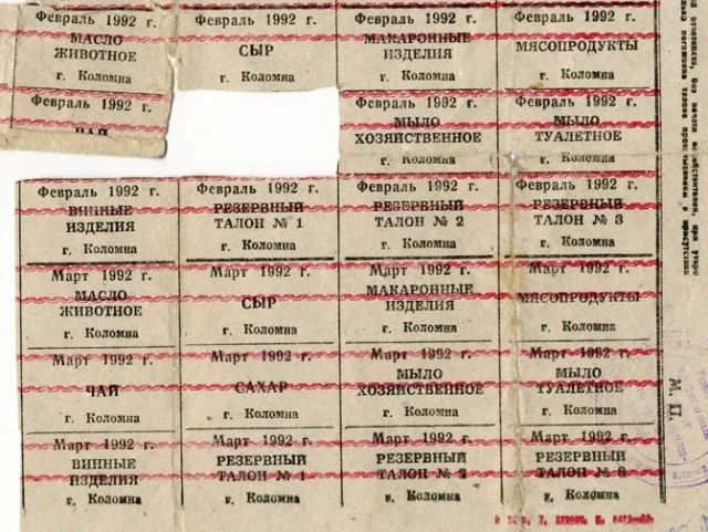 Продовольственный дефицит начала 1990-х привёл к введению почти во всех советских городах, включая Москву и Санкт-Петербург, социальных талонов и именных визитных карточек покупателя на ряд базовых товаров как табак, алкоголь, сахар, крупы, масло и другие. Их выдавали по месту прописки через ЖЭКи на один-три месяца. Большим страхом было потерять талоны, поскольку их не восстанавливали. Наибольшее распространение талоны получили в 1990-1992 годы, хотя в некоторых наиболее бедных регионах они были в ходу до 1996 года.