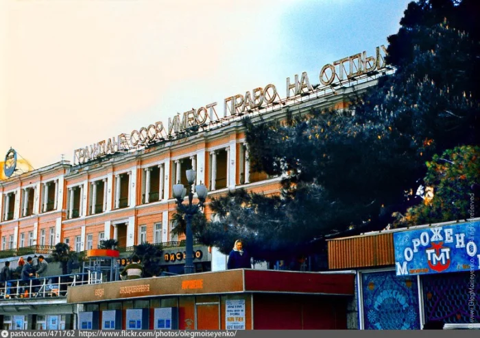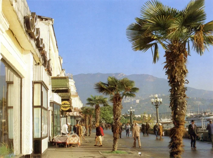 Набережная Ялты, где вывески утверждают, что все граждане СССР имеют право на отдых.