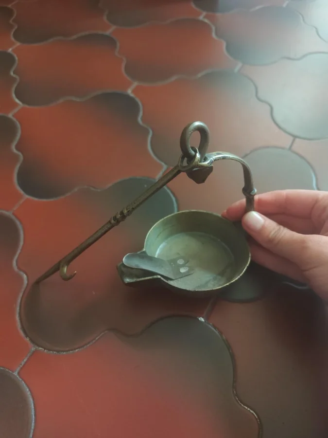 Это старая шахтёрская лампа на животном жире, использовавшаяся в XVIII веке.