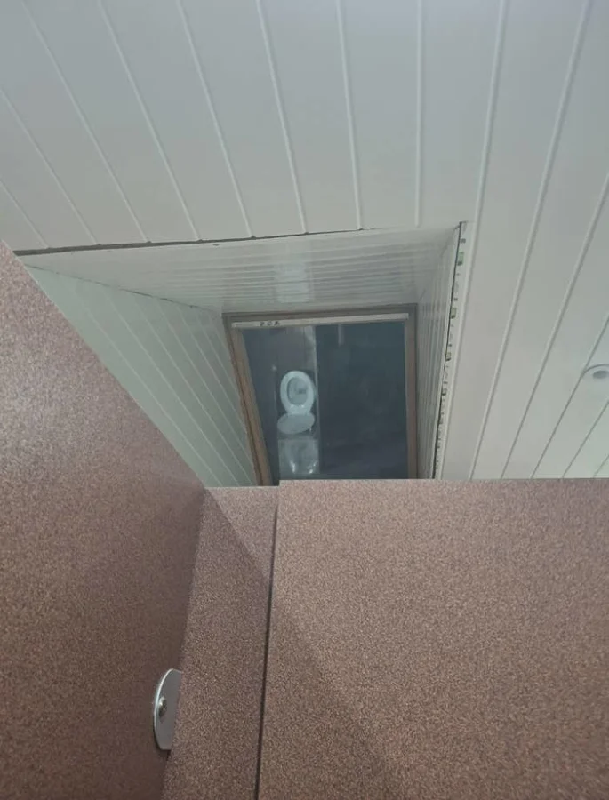 18. Туалет с мансардным окном, в котором отражаются соседние кабинки