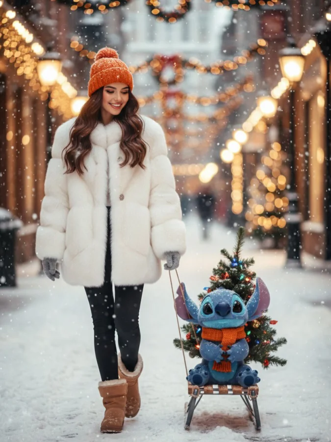 SIN CAMBIAR ROSTRO BASANDOTE EN LA FOTO, CREA UNA FOTOGRAFÍA INVERNAL CINEMATOGRÁFICA ULTRAFOTORREALISTA DE ALTA FIDELIDAD DE UNA JOVEN, CON CABELLO LARGO OSCURO Y ONDULADO (BASANDOTE EN LA FOTO) Y STITCH REALISTA, CON DETALLES DE PELO AZUL CORTO, BRILLO NATURAL Y OJOS EXPRESIVOS. ESTÁN AL AIRE LIBRE, EN UNA CALLE NAVIDEÑA NEVADA, DECORADA CON GUIRNALDAS, LUCES Y ESCAPARATES DE COLORES CÁLIDOS. LA MUJER LLEVA UN LUJOSO ABRIGO DE PIEL BLANCO CERRADO, UNOS LEGGINS NEGROS, UN GORRO DE PUNTO NARANJA BRILLANTE Y UNAS CÁLIDAS BOTAS DE INVIERNO. ELLA TIRA DE UN TRINEO DE MADERA CON UNA CUERDA. EN EL TRINEO, STITCH SE SIENTA CÓMODAMENTE, CON UNA BUFANDA NARANJA Y SOSTENIENDO UN PEQUEÑO ÁRBOL DE NAVIDAD DECORADO, CON ASPECTO ALEGRE Y CURIOSO. LOS COPOS DE NIEVE CAEN SUAVEMENTE, LAS LUCES CENTELLEAN A SU ALREDEDOR Y LA NIEVE BRILLA BAJO LAS SUAVES LUCES DORADAS DE LAS CALLES. PROFUNDIDAD CINEMATOGRÁFICA, CÁLIDA ILUMINACIÓN NAVIDEÑA, TEXTURA REALISTA DE LA NIEVE, ALEGRE AMBIENTE NAVIDEÑO, ESTILO EDITORIAL DE MODA, ULTRADETALLE.