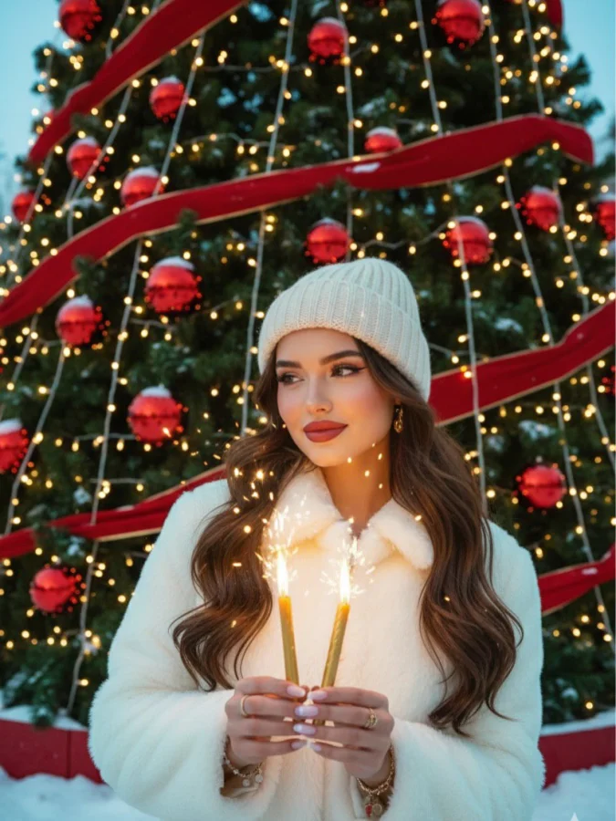 A young woman stands outdoors in front of a large green Christmas tree decorated with red ornaments, ribbons, and warm cascading string lights. She is wearing a fluffy white jacket and a cream-colored cap. Her very long, dark, wavy hair flows softly over her shoulders.