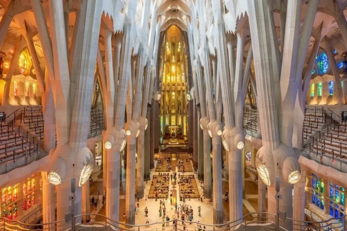 Столбы напоминают могучие деревья, а своды украшены звёздным узором. Восемнадцать остроконечных шпилей, олицетворяющих апостолов, евангелистов, Богородицу и Спасителя, гордо возвышаются к небесам. Внутреннее пространство озарено светом и украшено глубокой религиозной символикой.