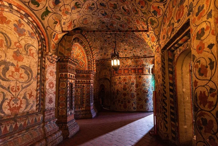 Его тесные коридоры, массивные каменные арки и древние настенные росписи погружают посетителей в атмосферу старинной, былинной Руси. Первоначально выполненный в белых тонах, в XVII столетии храм приобрел свою узнаваемую полихромную окраску, созданную под влиянием описания Небесного Града из Апокалипсиса Иоанна Богослова.