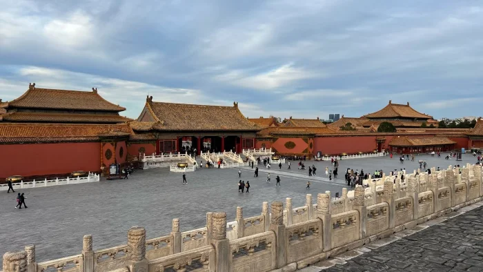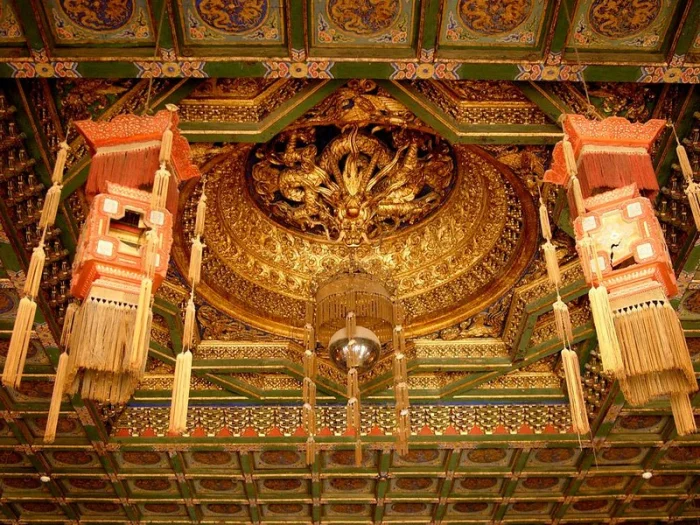 Внутренние помещения, включая Тронный зал Высшей Гармонии, впечатляют своими размерами, изысканной лаковой отделкой и обилием золотых элементов, символизирующих безграничную власть Сына Неба.