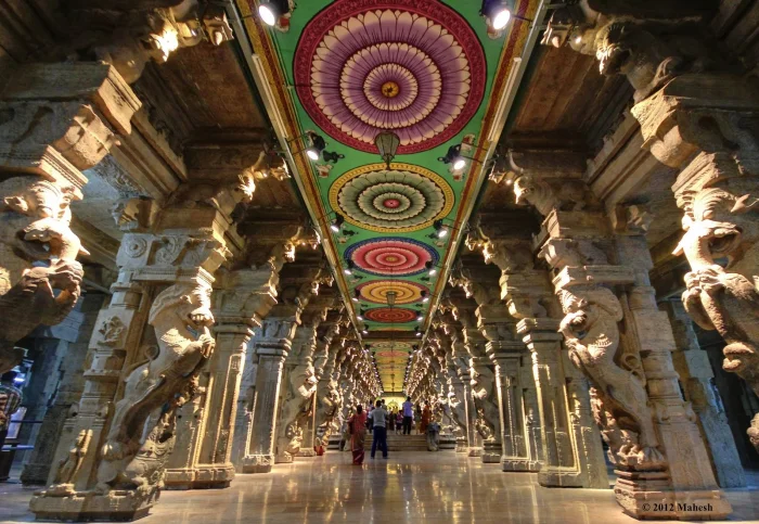 В тени четырнадцати величественных башен-гопурам, украшенных тысячами красочных скульптур, кипит жизнь древнего храмового города Мадурай. Внутри расположен знаменитый "Зал тысячи колонн", где на самом деле можно увидеть 985 искусно вырезанных столбов.