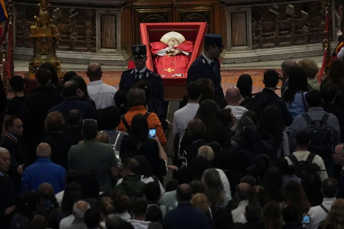 Ватикан, 25 апреля. Тысячи людей собрались у собора Святого Петра, чтобы проститься с Папой Франциском. Его тело доступно для прощания, и верующие выстраиваются в длинную очередь, чтобы отдать последние почести. Фото: Эндрю Медичини / AP.