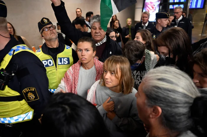 Шведская экоактивистка Грета Тунберг вместе с другими участниками международной флотилии «Сумуд» прилетела в аэропорт Арланда в Стокгольме 7 октября. Фото: Фредрик Сандберг / TT News Agency / AFP/Getty Images.