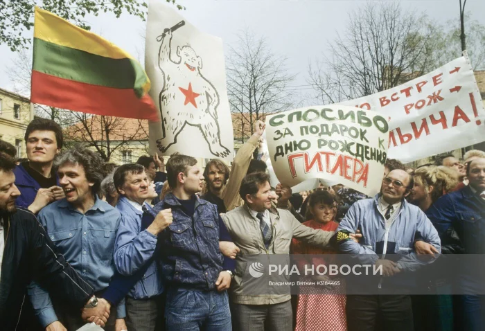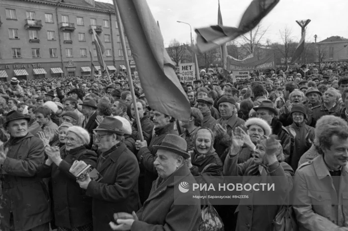 События, последовавшие после принятия решения о восстановлении независимости республики Верховным Советом Литвы 11 марта 1990 года. Митинг протеста, организованный движением "Единство", против решений Верховного Совета Литвы у здания ВС Литовской ССР.