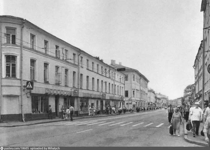 Застройка на Пятницкой улице в этом месте с тех пор не изменилась, а вот все магазины и кафе давно сменили, саму же улицу благоустроили