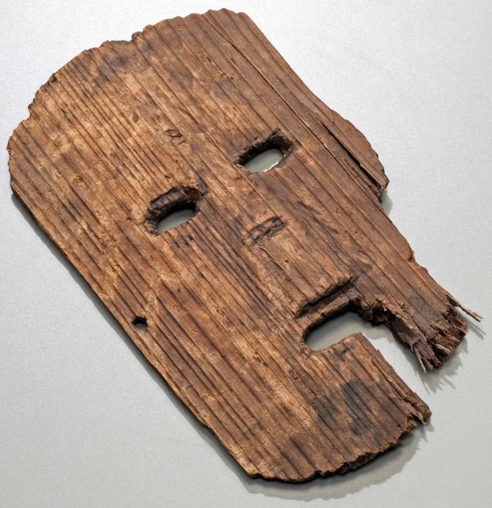 13. Деревянная маска, датируемая началом III века н.э., обнаруженная в 2023 году на руинах Ниси-Ивата в Осаке, Япония. Археологи полагают, что этот предмет использовался во время праздников урожая для обращений к богам
