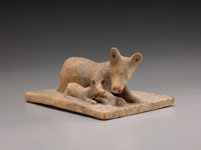 20. Терракотовая фигурка собаки со щенком, ок. начала V века до н.э., Беотия