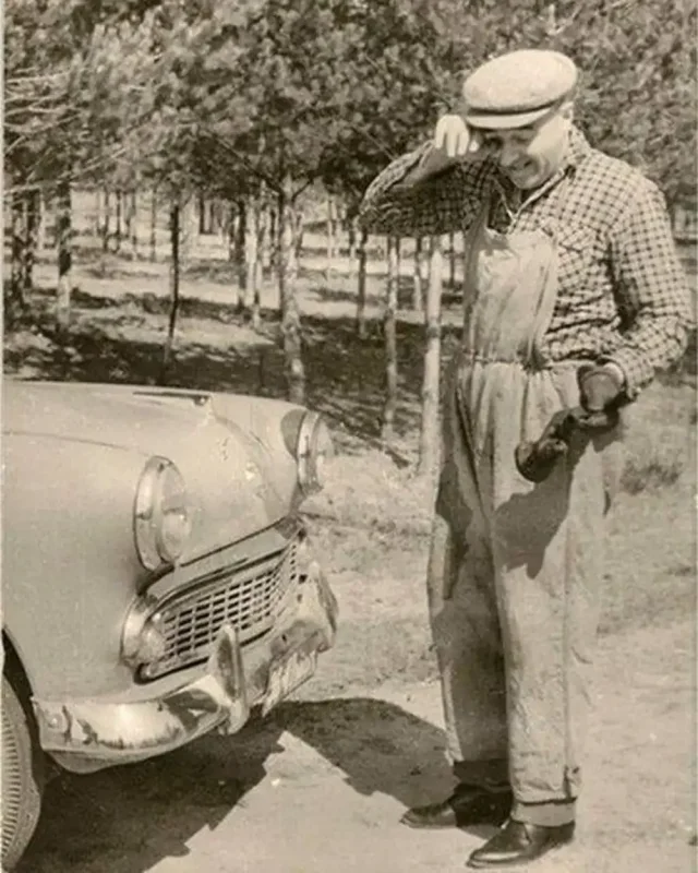 Владимир Этуш пытается починить свой Москвич-407. 1950-е годы