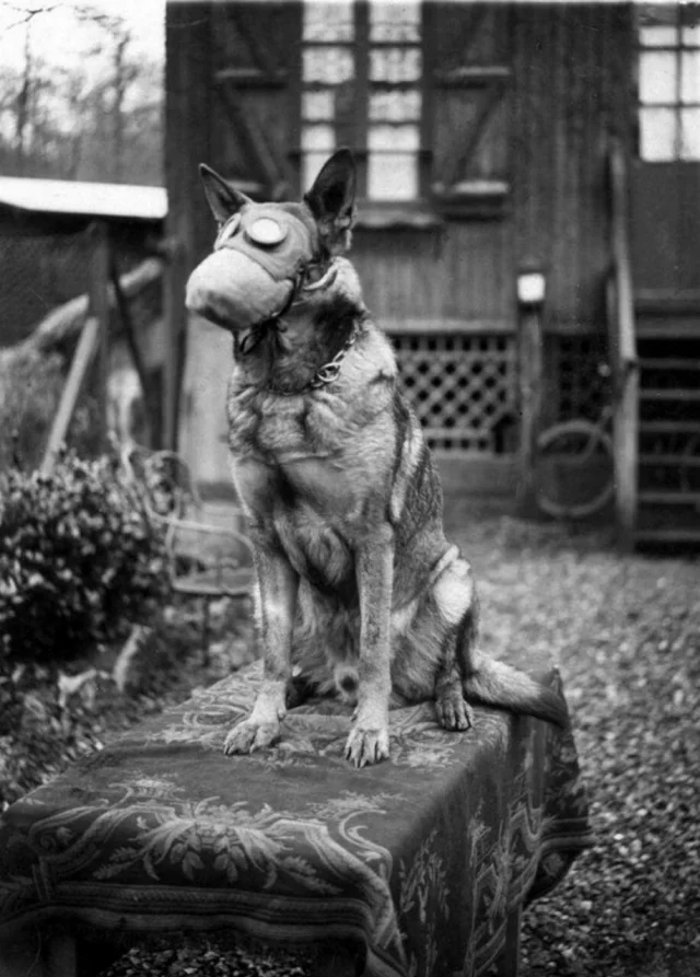 Собака, принадлежащая Французскому Красному Кресту, в противогазе, 1917 год