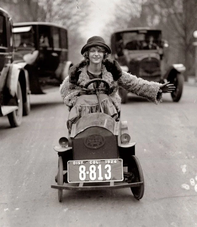 Оказывается, что эта идея отнюдь не нова. На снимке мисс Мэри Бэй едет по улицам Вашингтона на своём аккумуляторном Custer Car, а на календаре 29 января 1924 года.