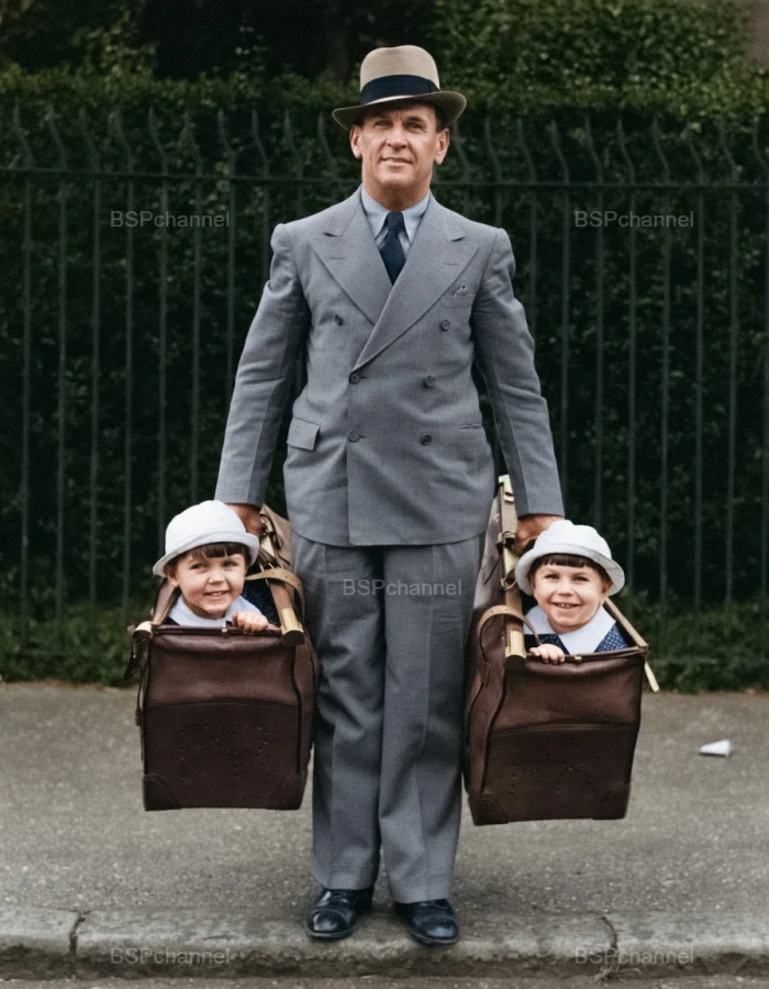 Мужчина несёт в сумках двух близнецов, 36-летних участников циркового номера, 1935 год.