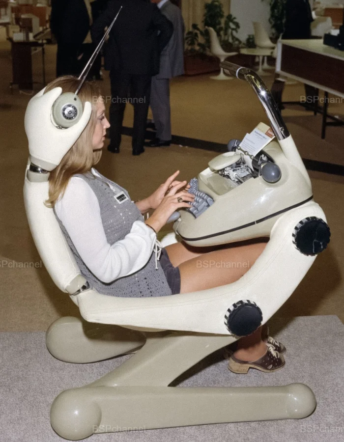 Демонстрация ретрофутуристического офисного кресла дизайнера Луиджи Колани на выставке «Эффективность бизнеса», 1971 год.