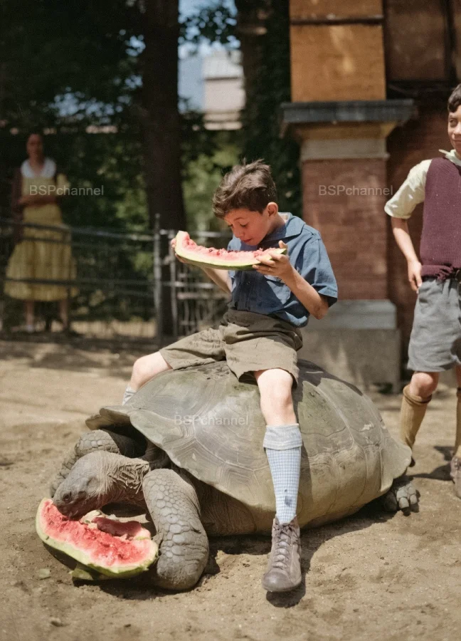 Мальчик и черепаха поедают арбуз в Зоопарке Бронкса, 1925 год.