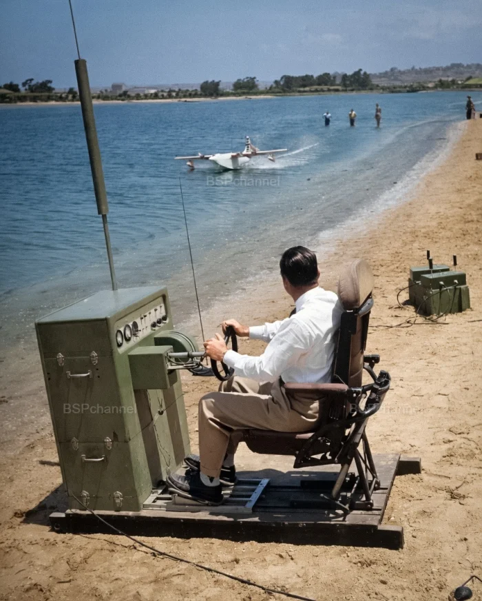 Говард Хьюз испытывает полет на радиоуправляемой масштабной модели Spruce Goose. США, 1940-е.